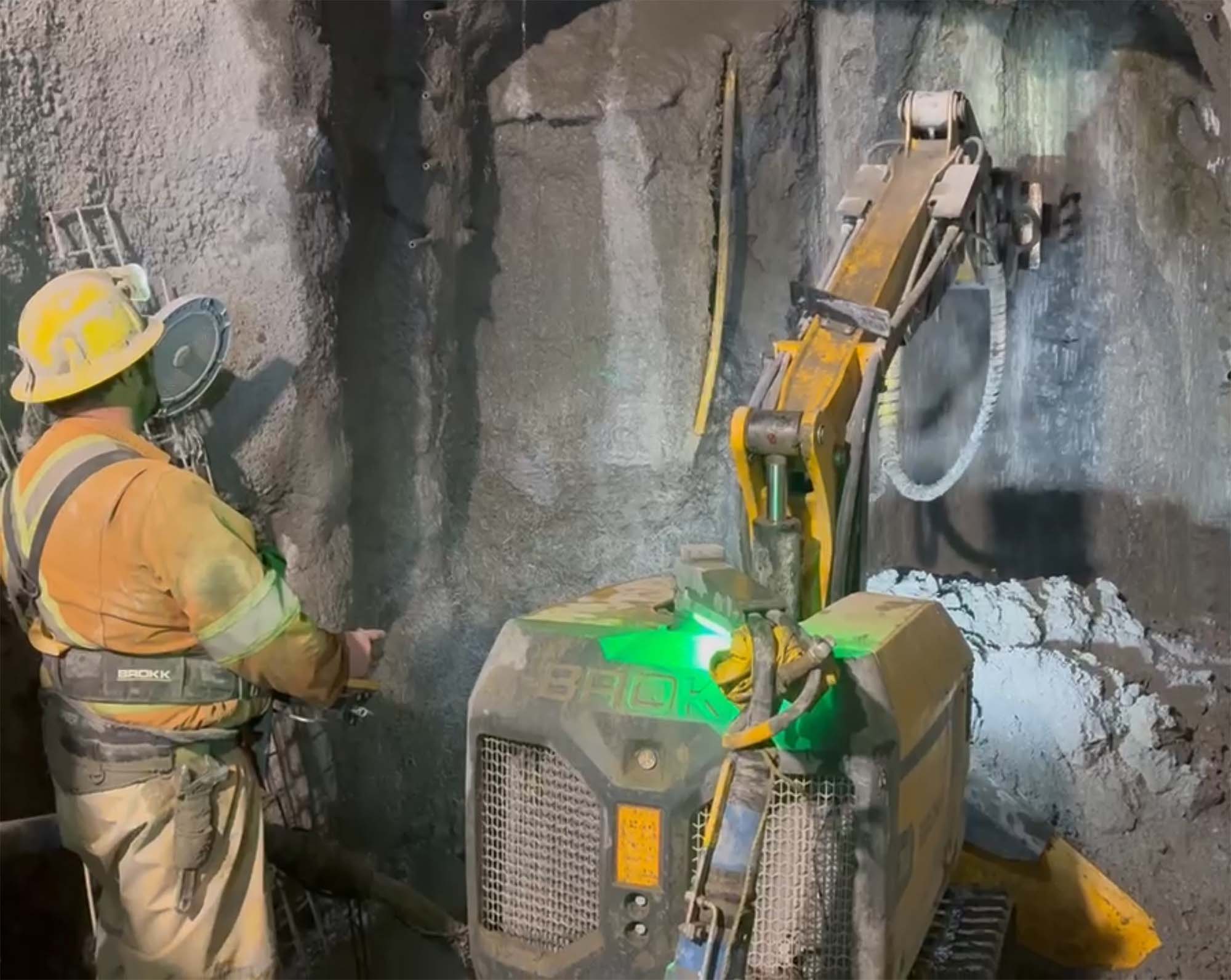 - Brokk Electric Demolition Robot – pictured here fitted with a drum cutter head, cutting into the crosscut face. (video available on website link above)