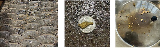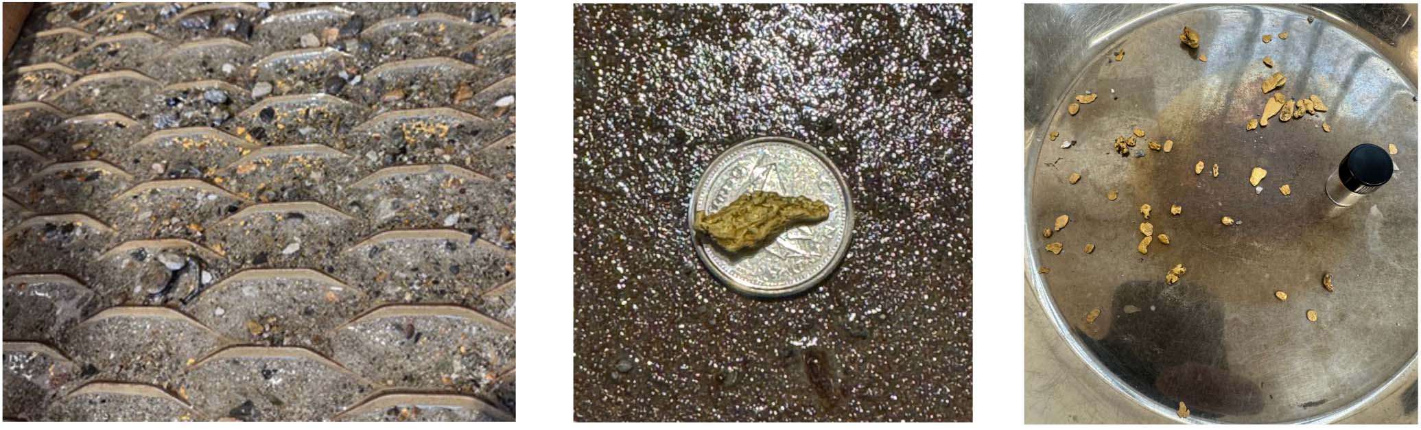 - Washplant Screen and Carpet – placer gold first caught after trommel and before boil boxes, some larger gold nuggets