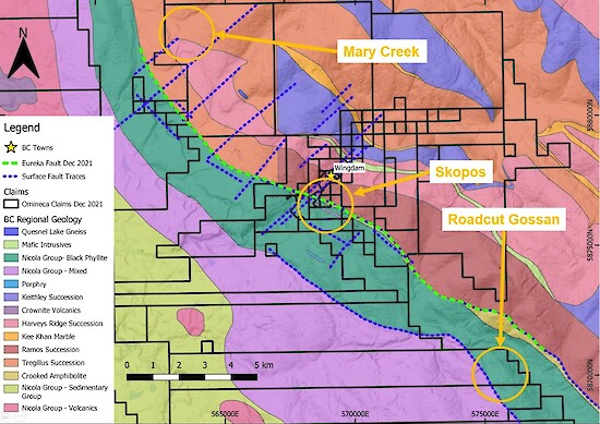 Stephen Kocsis, P. Geo., and lead geologist comments, “The 2021 exploration program, correlated with the 2020 data, is providing the geological team with highly prospective targets for the upcoming 2021/2022 drill season. With very limited historical hard rock mining, exploration or drilling in the area, the geophysical and geochemical programs continue to corroborate our general theory of the main structural setting for potential lode gold deposits that could have been the source of the autochthonous or locally derived placer gold found at Wingdam. We have several new soil and stream sediment gold and pathfinder element anomalies along trend proximal to a first-order thrust structure called the Eureka Fault. The trend extends about 11 km southeast to a newly discovered gossanous area and 8 km northwest to a lucrative placer gold area surrounding Mary Creek (the Toop Mine). Drilling will focus along the Eureka Fault trend in favourable places intersected by secondary north to northeast trending faults identified in geophysical surveys and chargeability zones identified along new induced polarization (IP) surveys.”